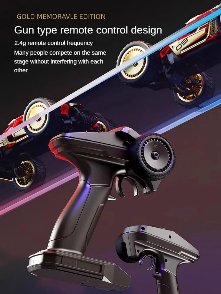 Built at a true 1:14 scale, this RC car mirrors real-life race buggies with intricate die-cast metal parts, a striking gold-red finish, and functional aesthetics that demand attention—perfect for shelf displays or racing action.